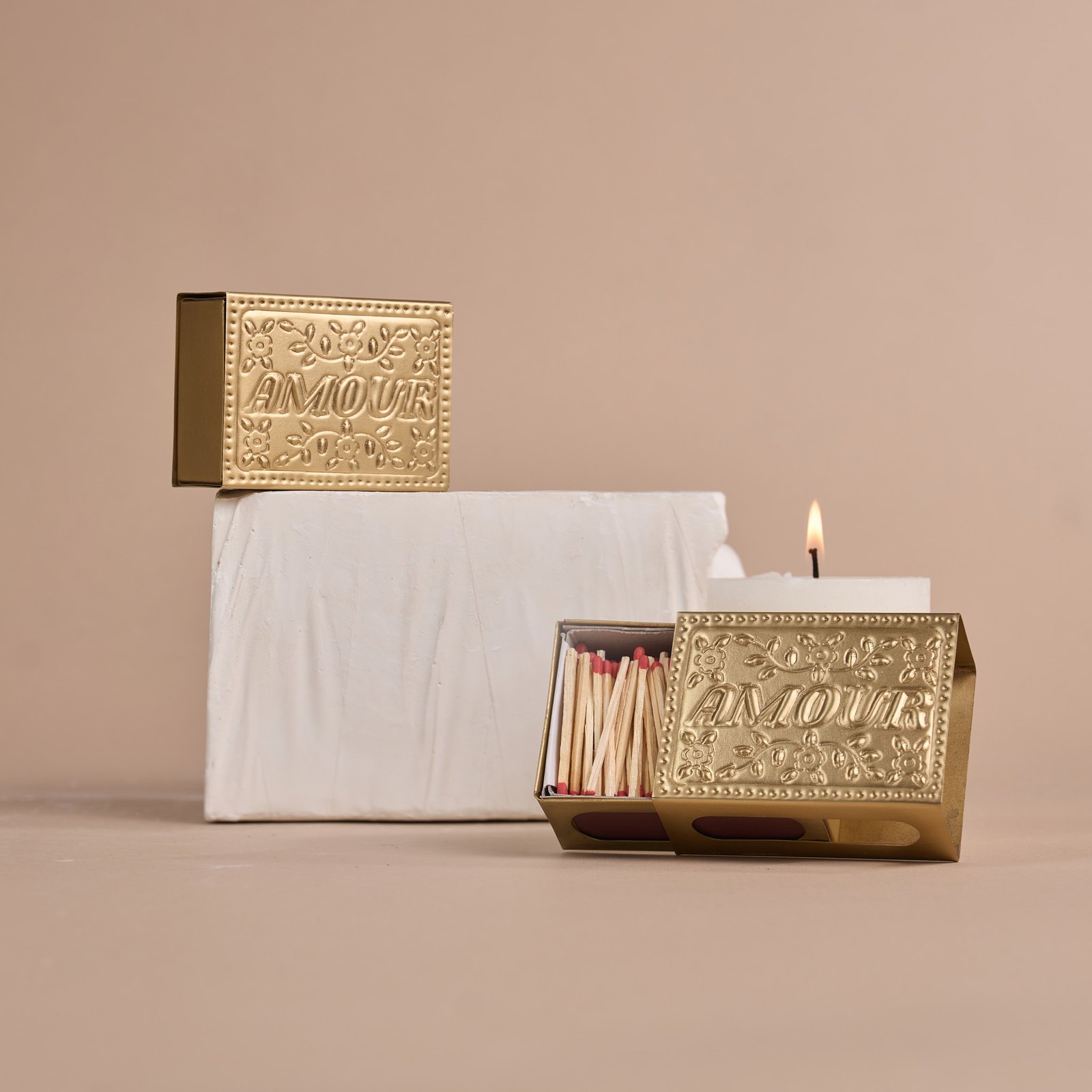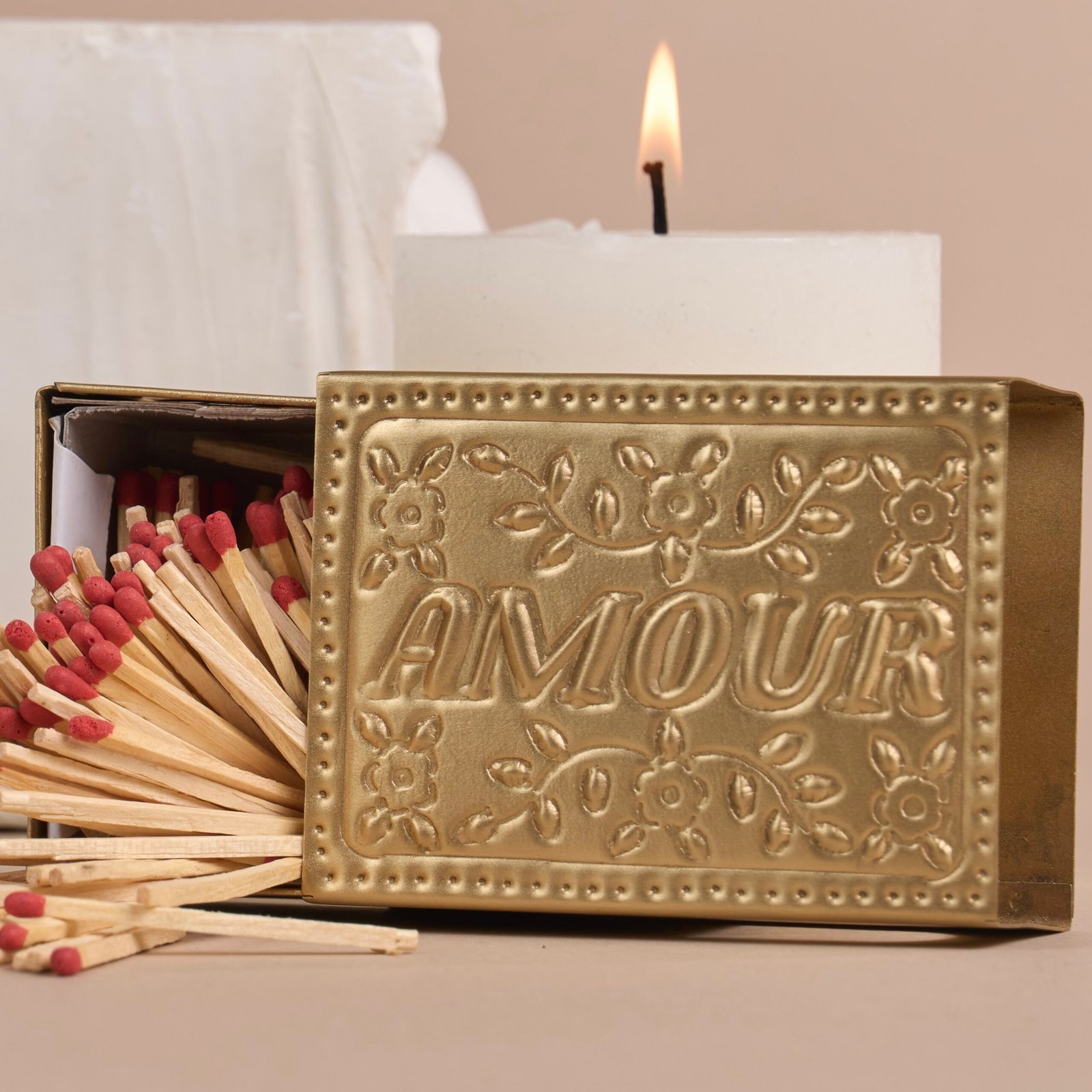 Voici les premiers écrins d’allumettes que vous allez adorer (vous) offrir. Ils deviennent de vrais objets décoratifs à poser à côté de vos bougeoirs. Beauté et noblesse du geste de craquer une allumette et de les tirer d’un écrin doré !