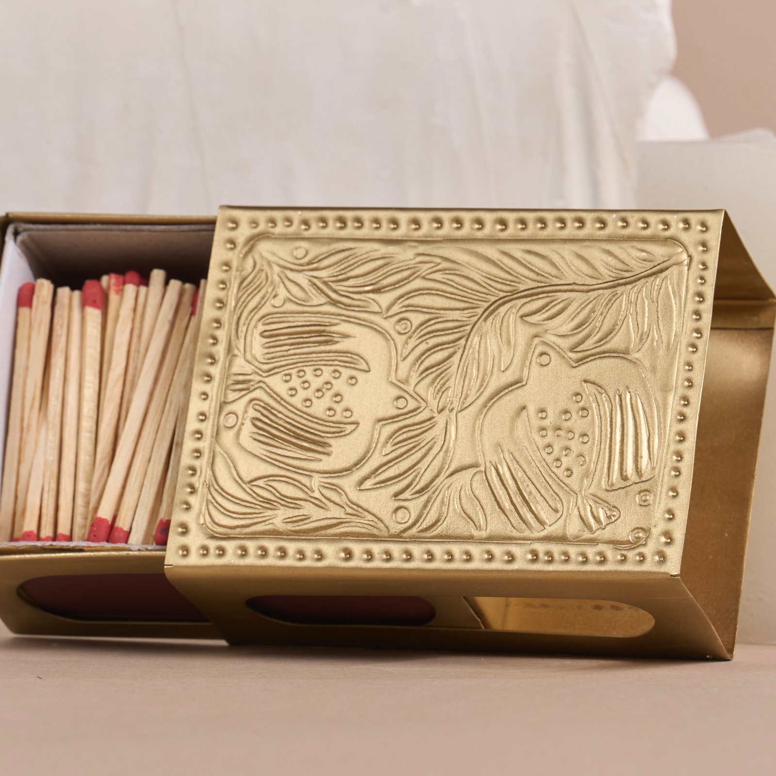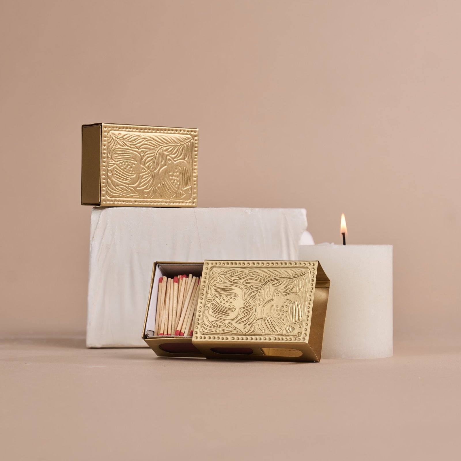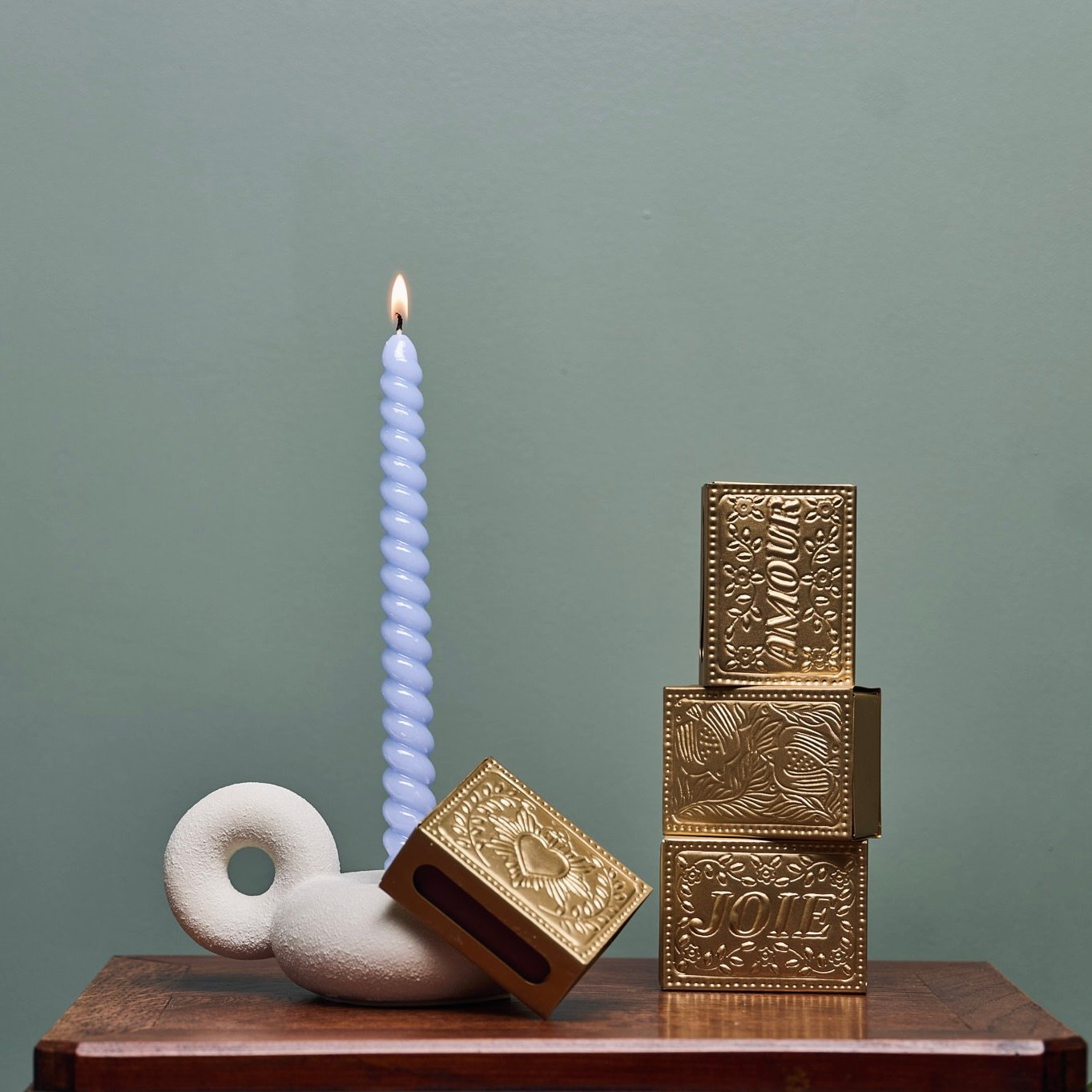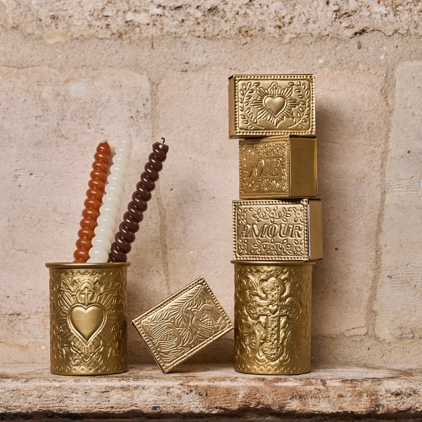 Voici les premiers écrins d’allumettes que vous allez adorer (vous) offrir. Ils deviennent de vrais objets décoratifs à poser à côté de vos bougeoirs. Beauté et noblesse du geste de craquer une allumette et de les tirer d’un écrin doré !