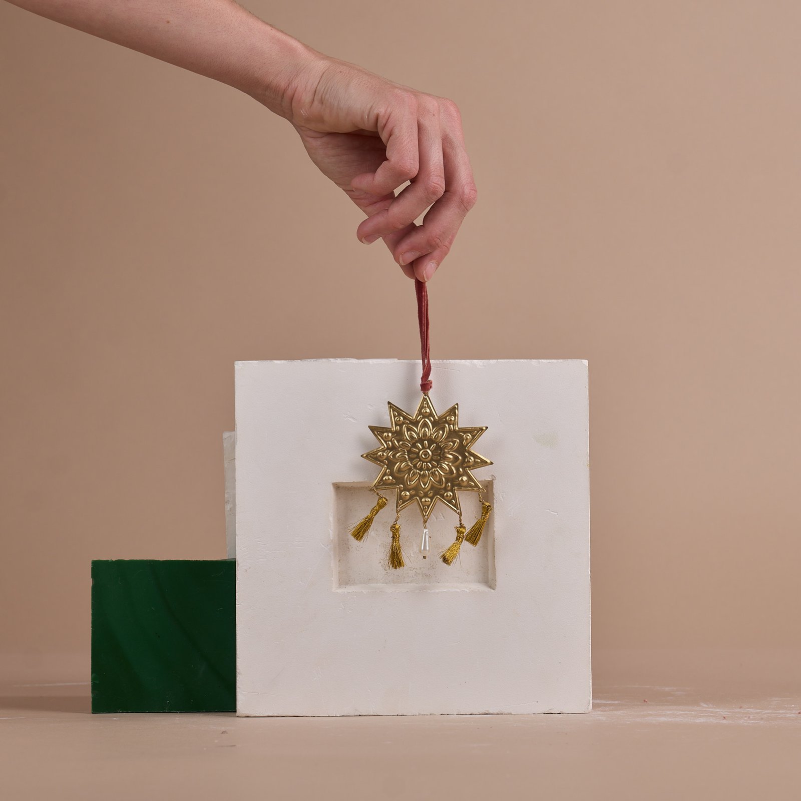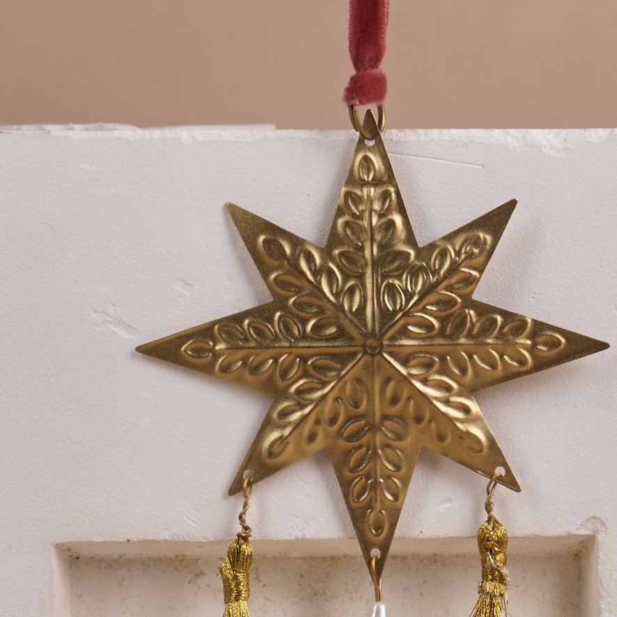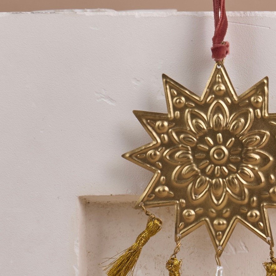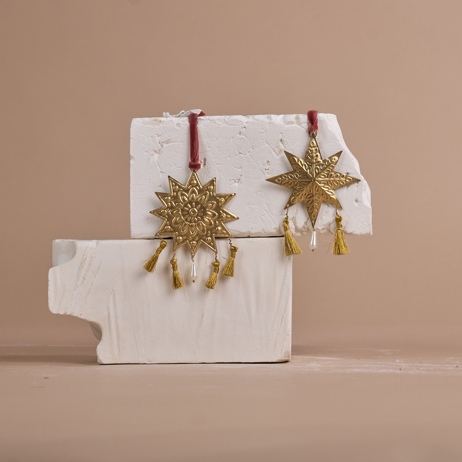 Une étoile et un soleil agrémentés de petits pompons dorés et d’une perle effet nacré pour donner du mouvement à vos ornements.